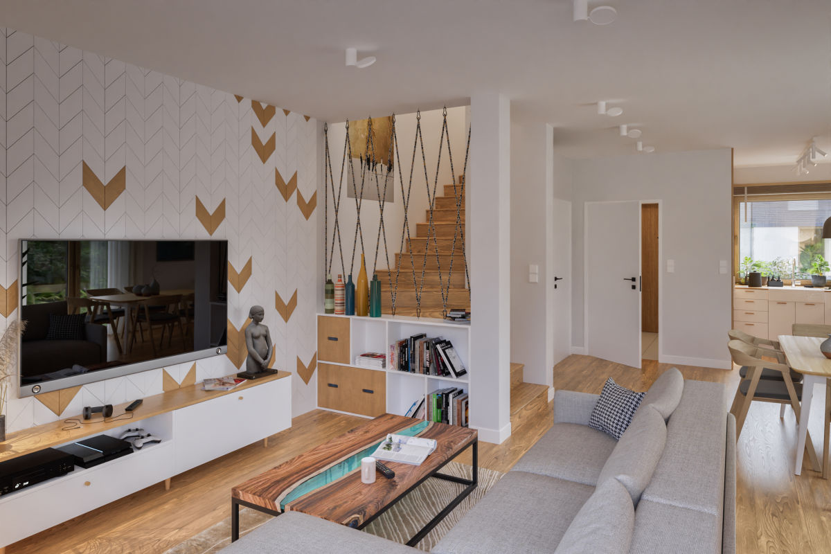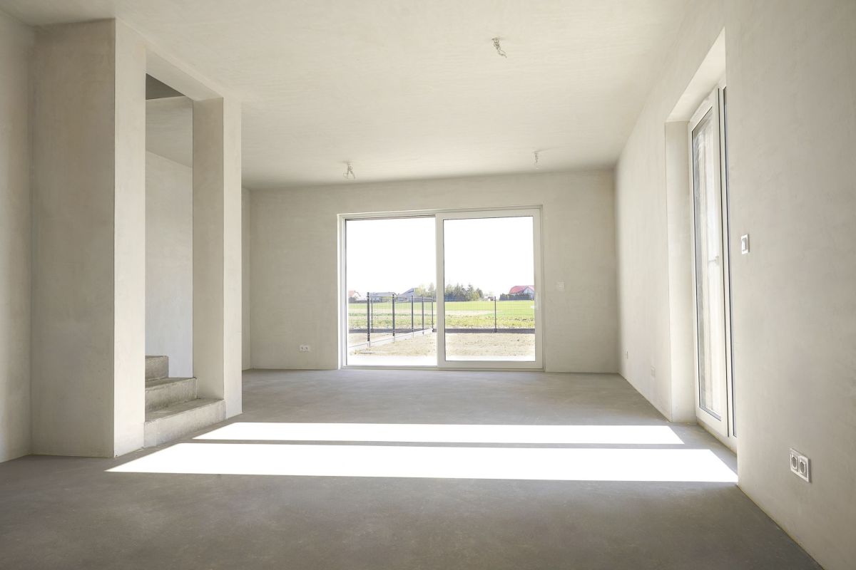 - Przestronny salon z dużymi, przesuwnymi oknami do podłogi, które doskonale doświetlają wnętrze i prowadzą na taras oraz ogród