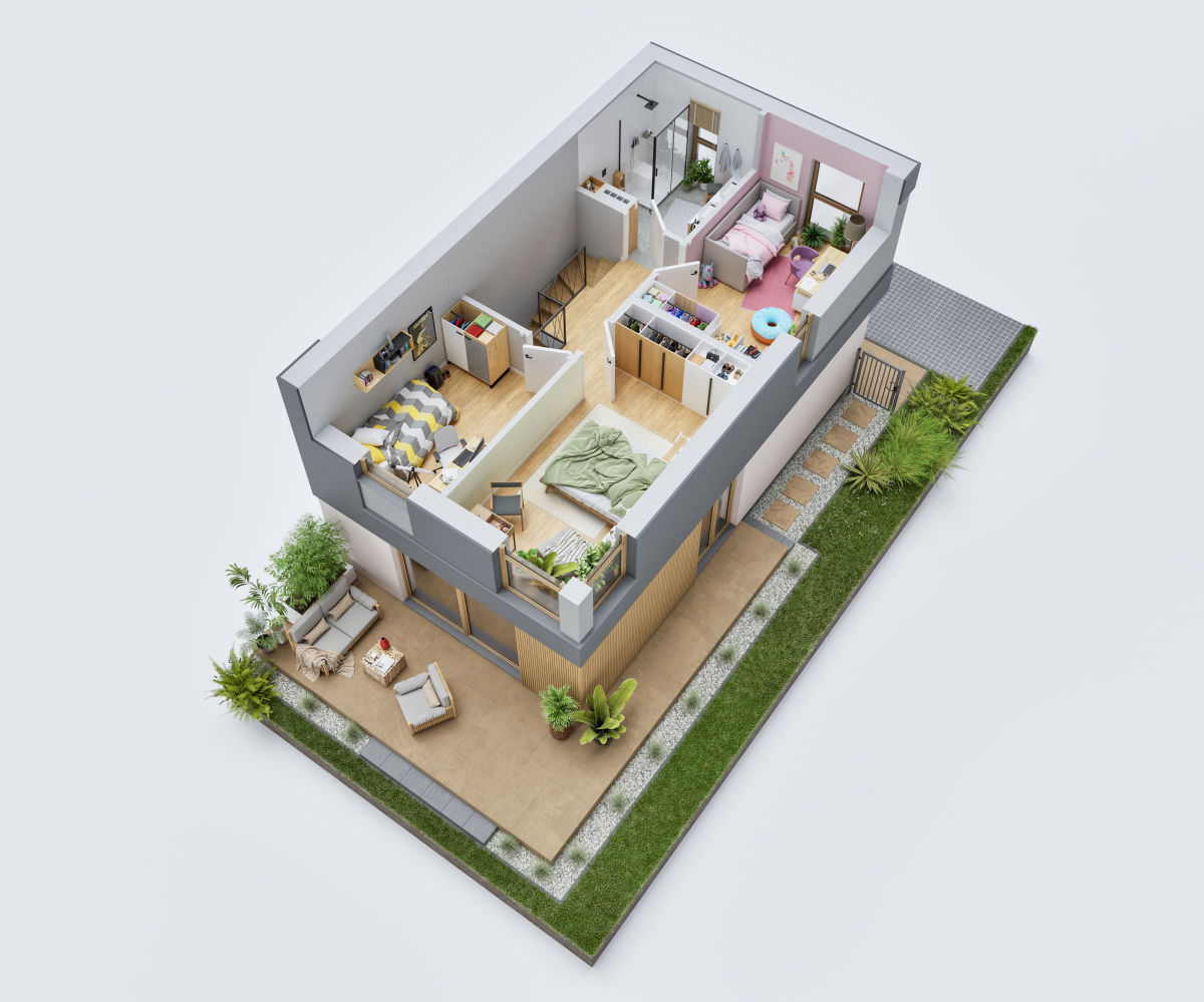 - Nasadzenia: trawa, tuje, cisy i ozdobna wiśnia.