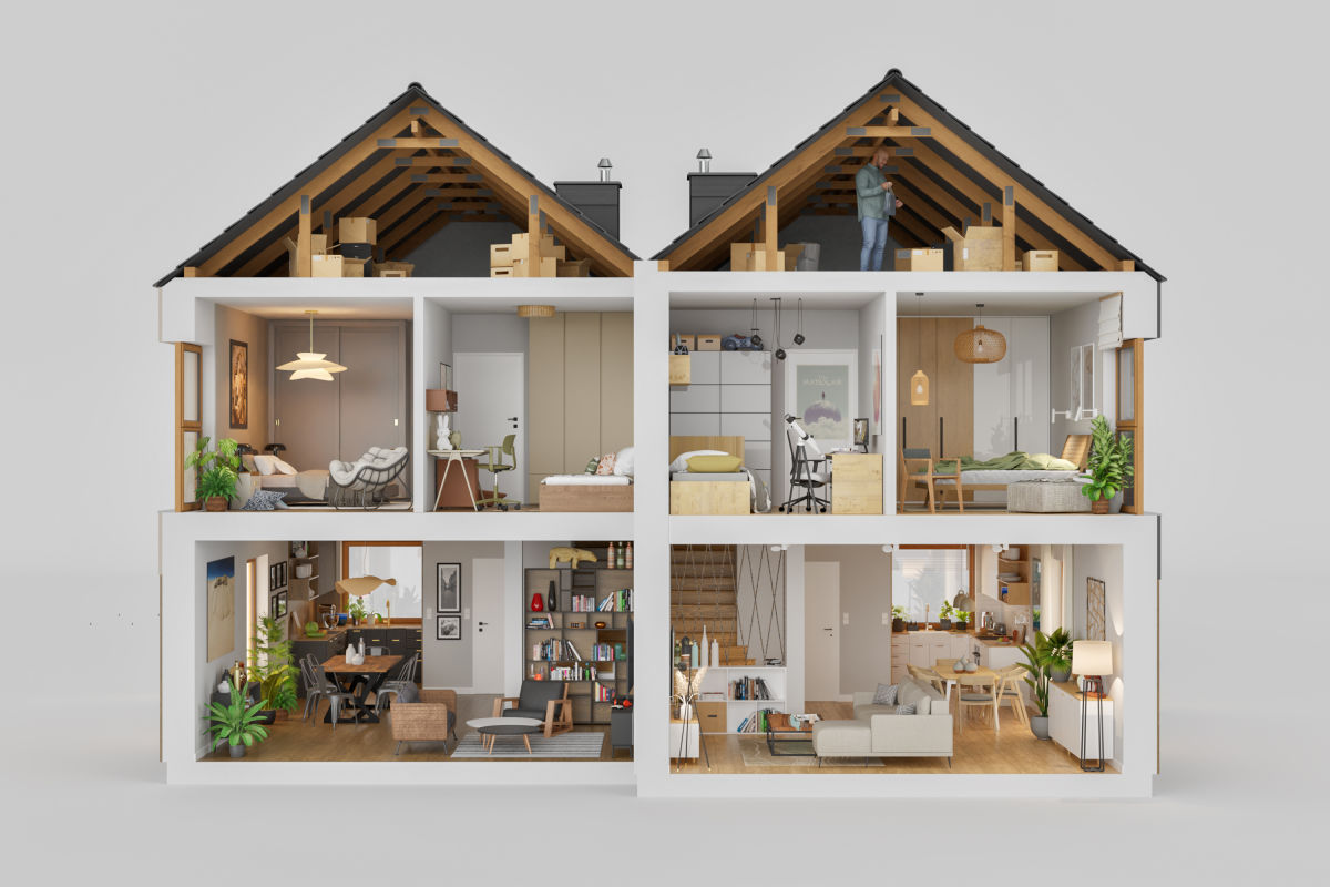 - Strych - wysokie pomieszczenie z oknem, wyłożone płytą OSB , to świetne miejsce na przechowywanie rzeczy