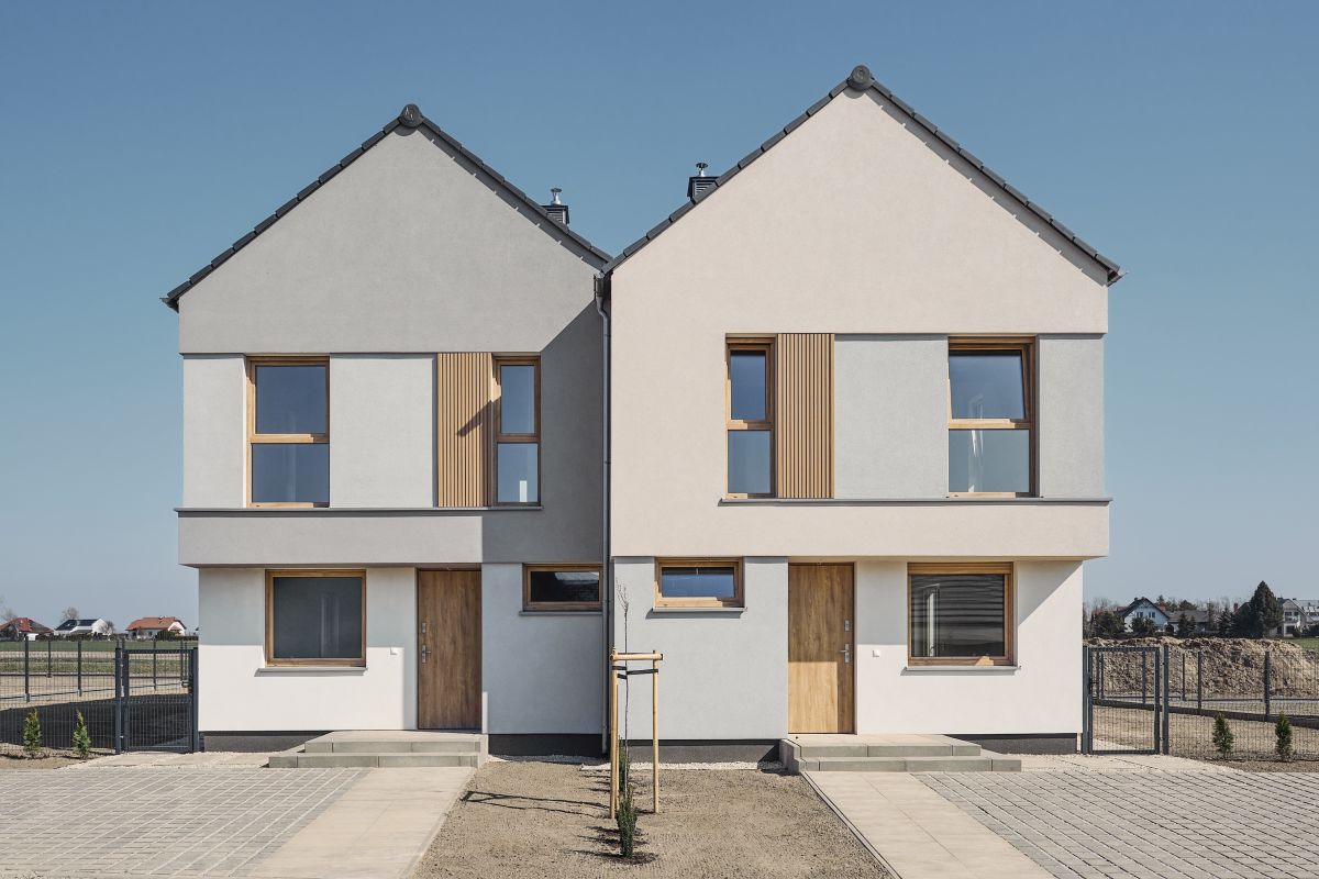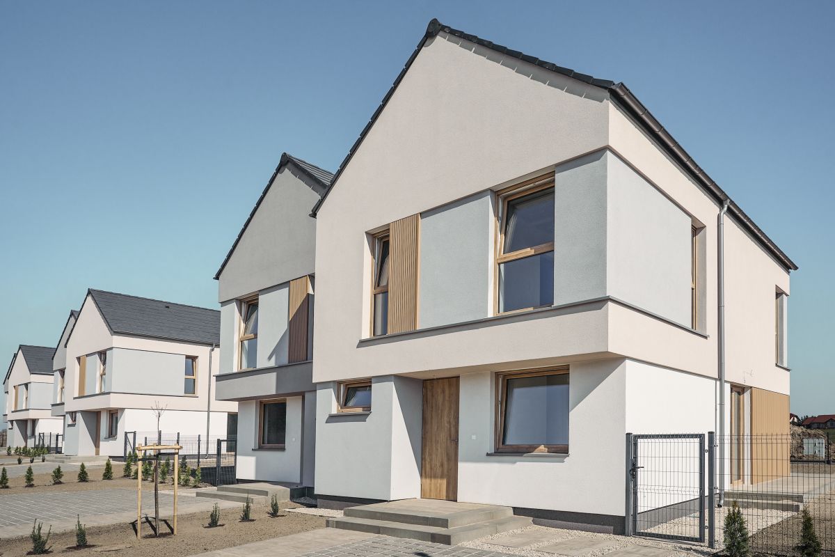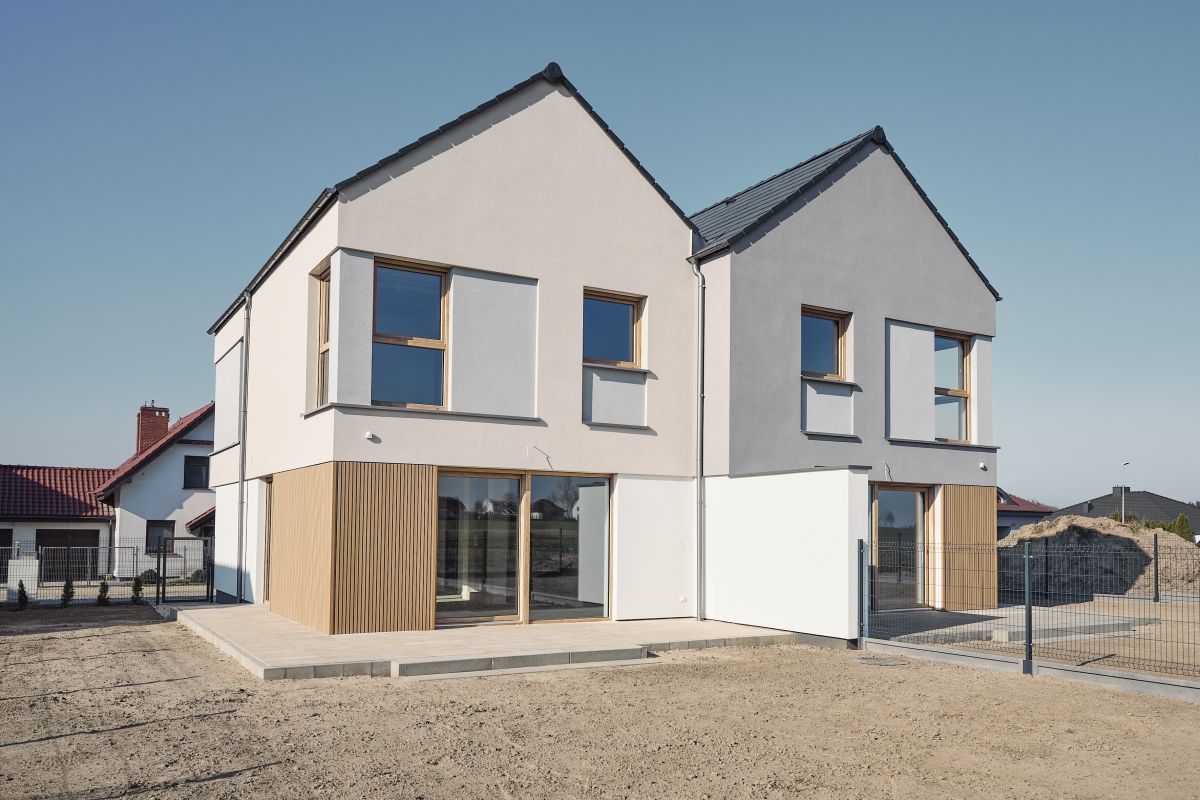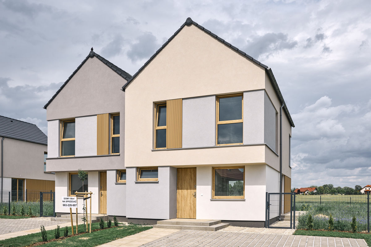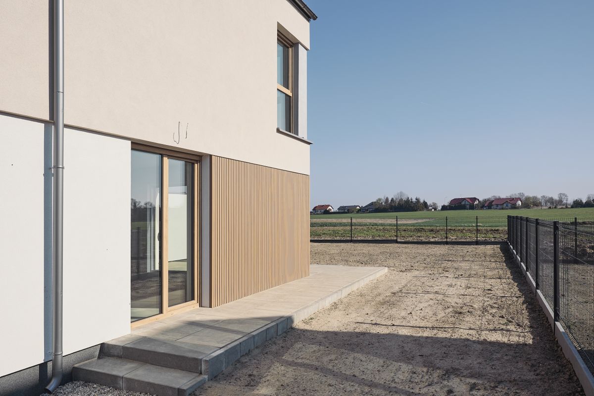- Elewacja z tynku sylikonowego z lamelami drewnopodobnymi.