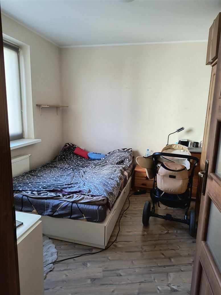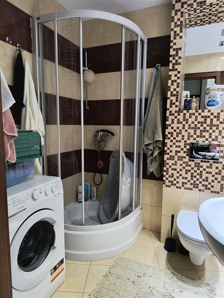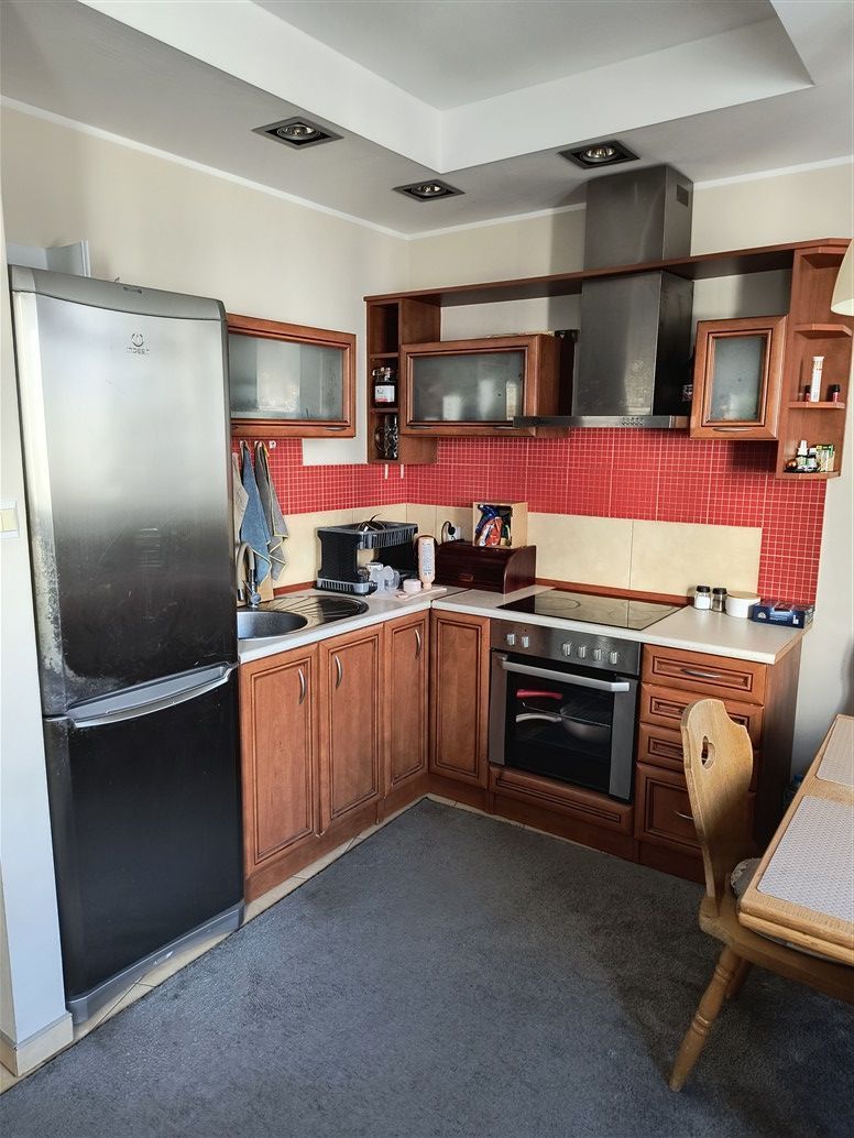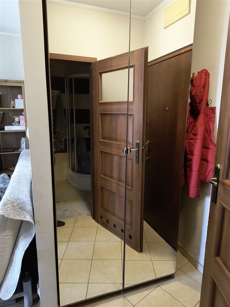 W korytarzu i w sypialni duża szafa. Kuchnia w zabudowie z lodówką, łazienka z pralką i kabiną prysznicową.